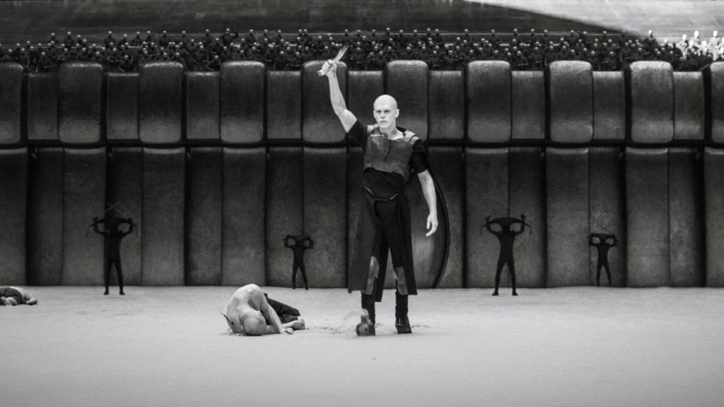 La secuencia del Coliseo es sin dudas una de las más impresionantes de esta secuela, ambientada en un planeta que se caracteriza por su sol negro -y la palidez de sus habitantes-, dando lugar a un despliegue impresionante de imaginería visual en escala de grises. Denis Villeneuve y su director de fotografía Greig Fraser (Rogue One, The Batman y la anterior Dune) juegan con las luces y sombras, la saturación y los contrastes para crear un universo opuesto a la calidez de Arrakis y sus icónicos atardeceres.