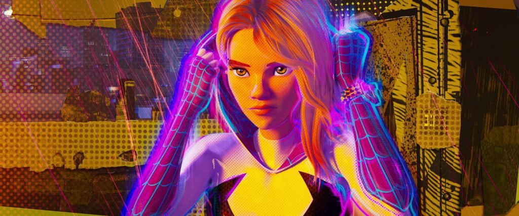 Introduciéndonos al mundo de Spider-Gwen, aquellos que conozcan al personaje por sus cómicss inmediatamente reconocerán cómo las portadas de su versión en papel son traídas a la vida. Predomina un fondo que parece estar hecho con una mezcla entre el gouache y la acuarela. Estos son materiales parecidos, siendo el primero una pintura más opaca que no permite la trasparencia y logra los colores vibrantes que identifican a Gwen Stacy.