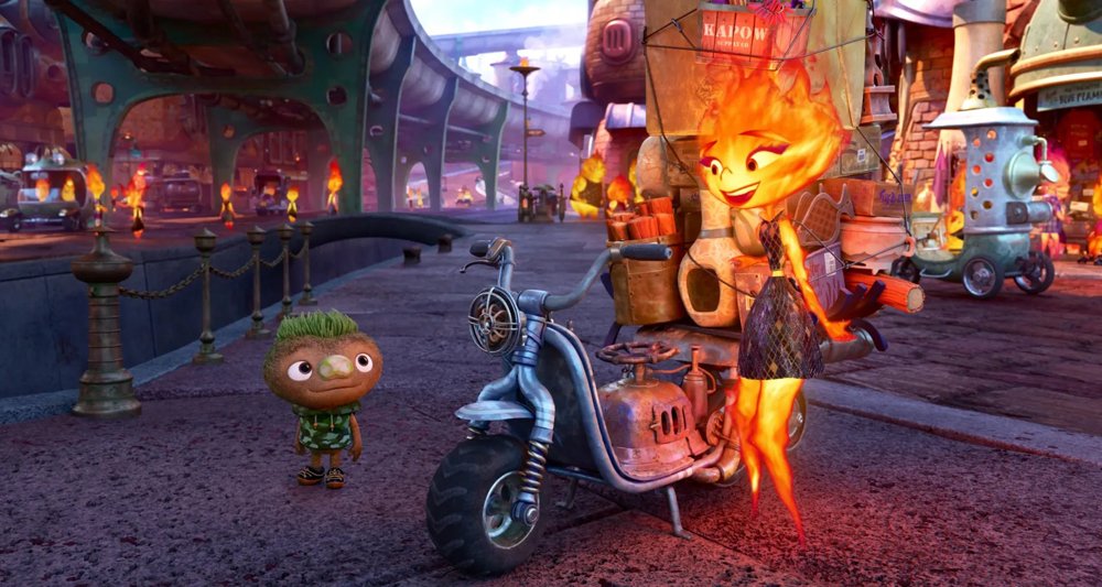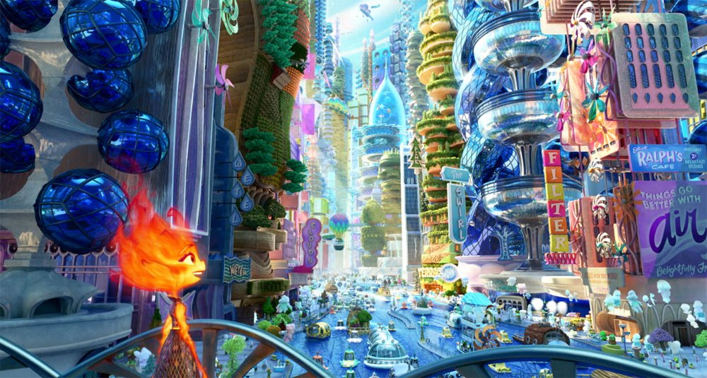 Quizás no tan convincente resulta el mundo que nos presentan. Con muchos rasgos en común con Zootopia (2016), aquellas metáforas que funcionaban tan bien en una ciudad donde depredadores y presas de todos los ecosistemas convivían, son coherente en Ciudad Elemento pero no terminan creando un mundo igual de creíble. Al final del día recae en la lógica de una película infantil, en donde solo tenemos que aceptar que mientras ciertos personajes son seres hechos de agua y sentientes, también aparentemente conviven con agua común.