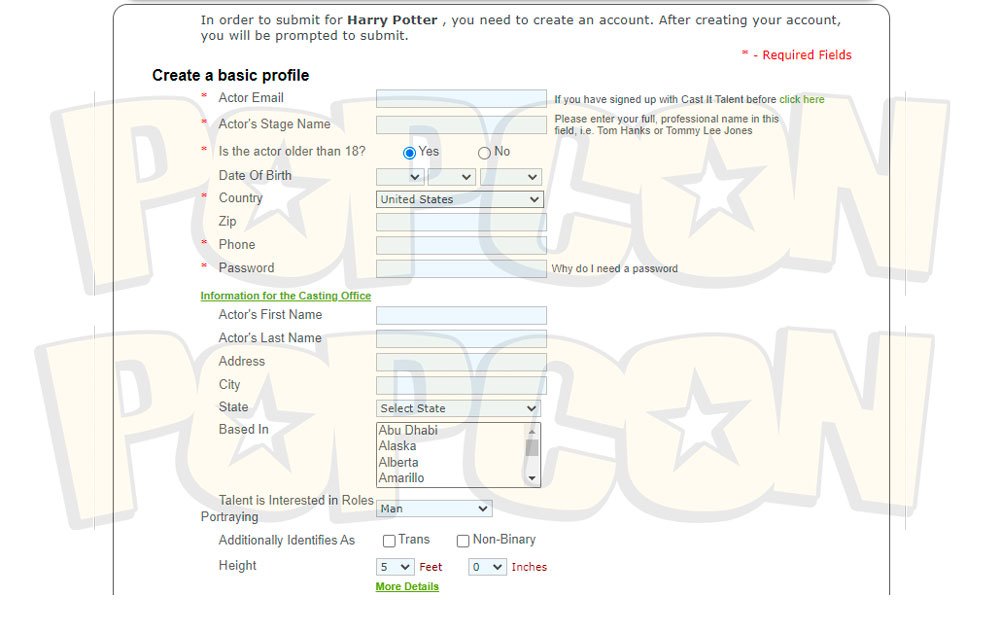 Al llegar a esta parte, ya aparecen los botones para enviar la solicitud como Harry Potter, Ron Weasley o Hermione Granger, en cada caso. Y donde primero los actores deberán registrarse y -al ser menores de edad-deberán completar algunos datos del padre, encargado o tutor.