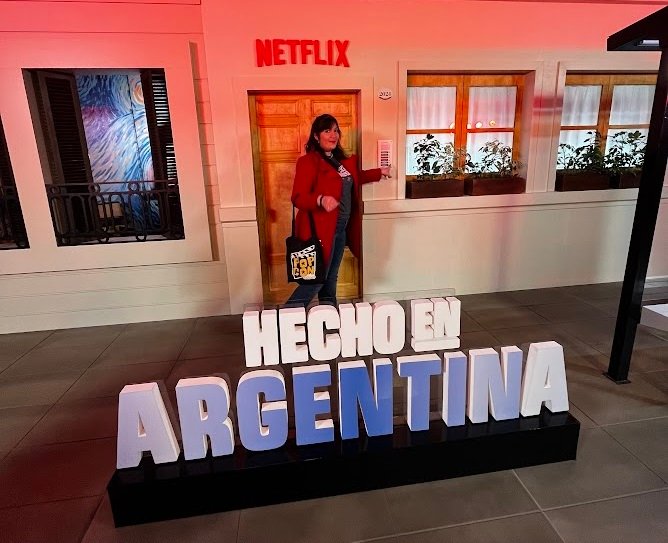 Mientras el cartel va cambiando de frases en una pantalla gigante luminosa, el fotógrafo oficial me ve vestida de rojo, el color de Netflix, y me pide unas fotos. También nota el labial rojo, un detallazo de esos que se aprecian cuando la gente que está trabajando realmente se dedica a lo que le gusta.
