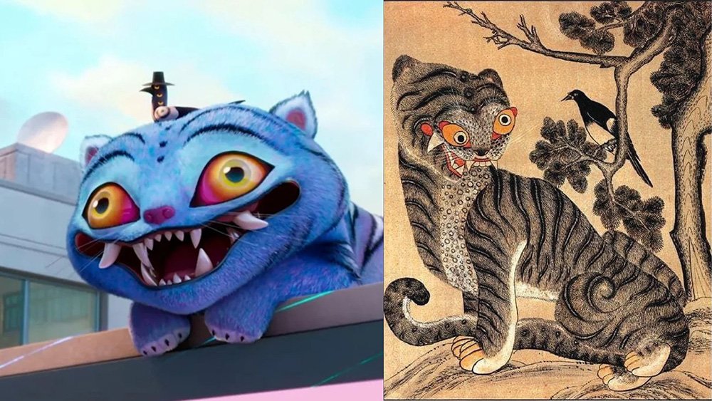 Un hermoso ejemplo -y definitivamente, uno de mis favoritos- es Derpy, el tigre que vemos en varias ocasiones aparecer como medio de comunicación entre Rumi y Jinu. La imagen del tigre posee una gran importancia en la cultura coreana. En la época de la dinastía Joseon (previo a lo que conocemos hoy como Corea) las pinturas con tigres formaban parte del folklore tradicional.