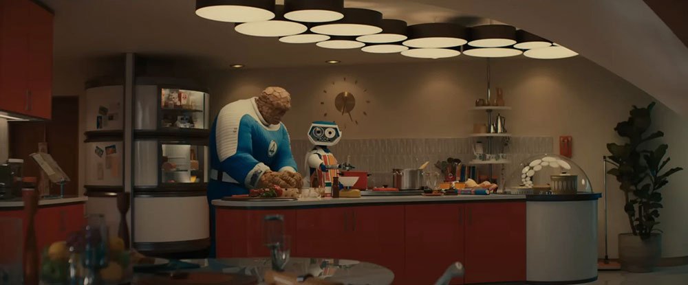 Ebon Moss-Bachrach, famoso por haber hecho del primo Richie en el drama cómico de cocineros The Bear, acá intepreta a otro miembro honorario de una familia, de esos que no son vínculos de sangre pero sí de corazón. Ben Grimm, el mejor amigo de Reed, un ex astronauta cuya piel fue transformada en capas de roca desértica naranja que le otorgan superfuerza y resistencia, es uno de los personajes más entrañables de los cómics. La escena del teaser, donde se lo ve cocinando junto al robot mascota de la familia, H.E.R.B.I.E., es tanto un guiño a The Bear como una manera de conectar con el público. El robot en sí mismo es otra referencia televisiva, ya que se tuvo su primera aparición en la serie animada de fines de los años setenta.