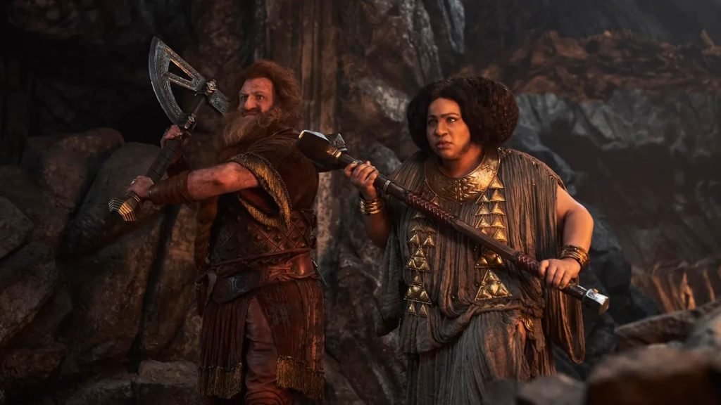 Por otro lado, los sucesos en el reino de los enanos siguen siendo más una excusa para explorar en la mitología literaria, que realmente un punto a tener en cuenta de lo que se avecina. Por lo que el argumento se hace blando, al brindar un alivio cómico en la forma de Durin (Owain Arthur) y su esposa Disa (Sophia Nomvete).