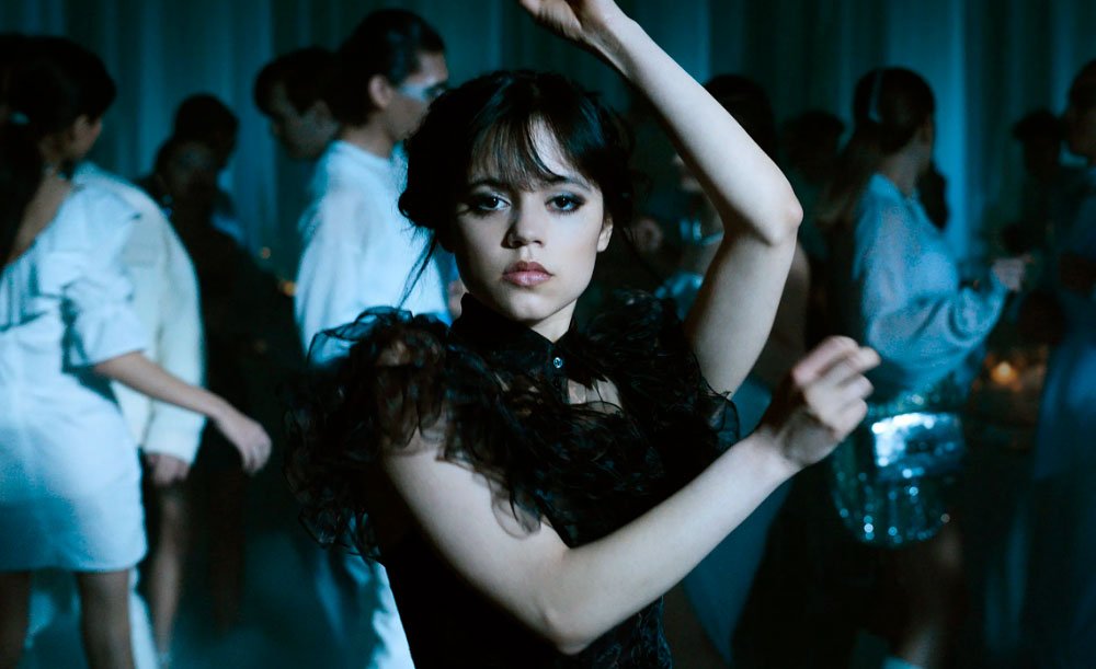 Jenna Ortega (Scream, You, X) encarna esta versión teenager de Merlina con todas las complejidades que un personaje de su edad puede tener, incluída su rebeldía ante los mandatos familiares y desprecio por la autoridad, una curiosidad insaciable y hasta un triángulo amoroso. Y lo hace con una soltura que le permite apropiarse por completo del personaje, mientras homenajea la recordada interpretación de Christina Ricci en las películas de los noventa. El principal rasgo distintivo de esta versión -a nivel físico- es el flequillo que acompaña las clásicas trenzas del personaje. Mientras que a nivel interpretativo, Jenna Ortega le aporta una fisicalidad impresionante, desde su postura mortuoria para caminar hasta la danza macabra del baile de promoción.