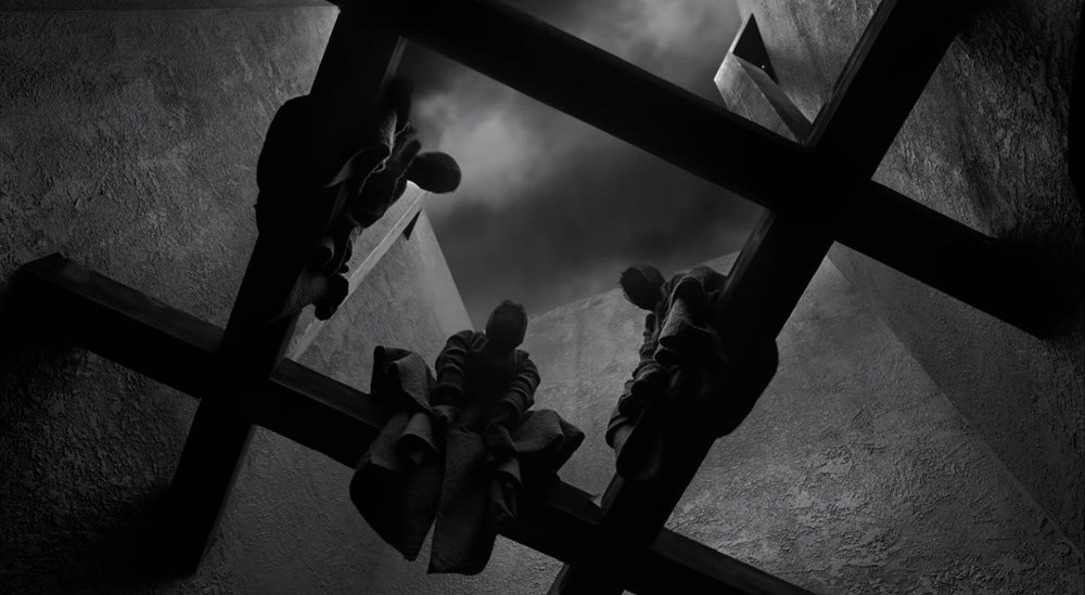 Casi reflejando las constantes dualidades que marca el texto, el tajante claroscuro marca composiciones que remiten, primeramente, al expresionismo alemán, haciendo que los espacios tengan un toque surrealista. La arquitectura del castillo de Macbeth da la sensación de estar sacada directamente de una pintura de Chirico. Los escenarios resultan minimalistas, pero no por eso menos impresionantes. Logrando que, lo que en otras adaptaciones se presentó como un campo de batalla, se convierta en esta versión en una pelea tan claustrofóbica como austera en un pasillo. Decisión que, sin duda, sería una manera de resolver un dilema en un escenario teatral y que resulta igualmente efectiva en esta propuesta. Y es esa sensación de artificio la que refuerza la idea de que lo que está frente a nuestros ojos es más cercano a una obra de teatro que una película.