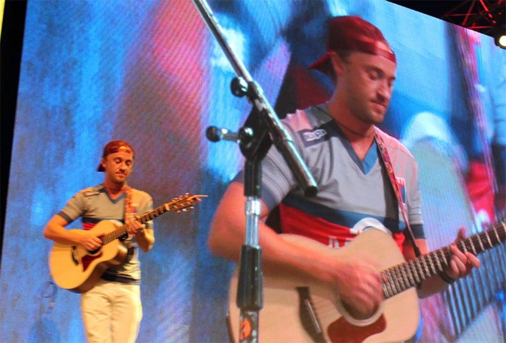 Tuvimos el placer de escucharlo arriba del escenario, donde cerró la presentación del sábado tocando su guitarra al ritmo de «Singing in the rain« con la letra levemente modificada para incluir a Argentina. El domingo también se despidió tocando otro de sus temas originales con la camiseta de la selección nacional puesta. El auditorio estalló en gritos y aplausos, que Tom recibió encantado. Nos confesó que actualmente está dudando si seguir adelante con su carrera musical, considerando que hay tantos artistas talentosos que él no sabe si tiene lo que hace falta para destacar, pero lo alentamos a seguir adelante. Después de las ovaciones que recibió en el escenario, seguramente lo tendrá en cuenta.