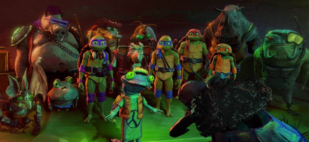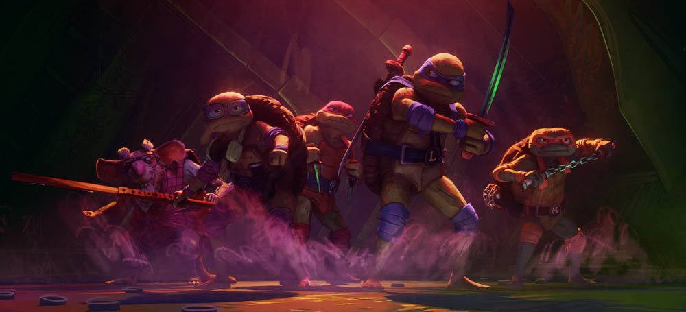 Es así como detrás del genio criminal Superfly (Ice Cube), las tortugas descubren una comunidad tan distinta al mundo de los humanos como son ellos mismos, pero que al mismo tiempo representa una amenaza a todo lo que conocen. Aparece entonces un colorido elenco de criaturas entre los que se destacan Ray Fillet (Post Malone), Wingnut (Natasia Demetriou), Leatherhead (Rose Byrne), Rocksteady (John Cena), Bebop (el productor y co-escritor de la película, Seth Rogen) y un Paul Rudd como el simpatiquísimo Mondo Gecko. La búsqueda por aquello que consideramos nuestro lugar en el mundo y el dolor de encontrarse marginado se plantea desde un lugar simple pero muy honesto. Paralelamente se desarrolla lo que es sin duda el corazón de la historia, un relato también sobre pertenencia pero enfocado en la familia. Parte del peso de este coming of age recae en un Splinter muy aprovechado, que debe lidiar con como sus hijos están creciendo y aprender a confiar en sus decisiones.