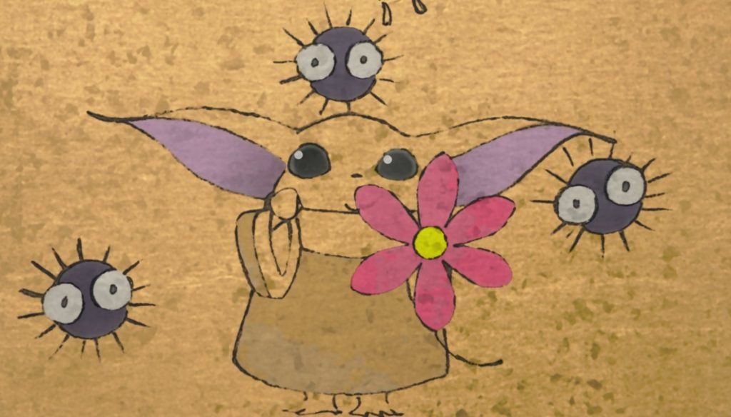 Para el joven Grogu, la meditación es de considerable importancia. También aprender a utilizar sus formidables poderes. Por ese motivo, la interrupción de los espíritus del hollín es un trastorno mayor. Así comienza la historia de tres minutos de la histórica colaboración entre Studio Ghibli y LucasFilm.