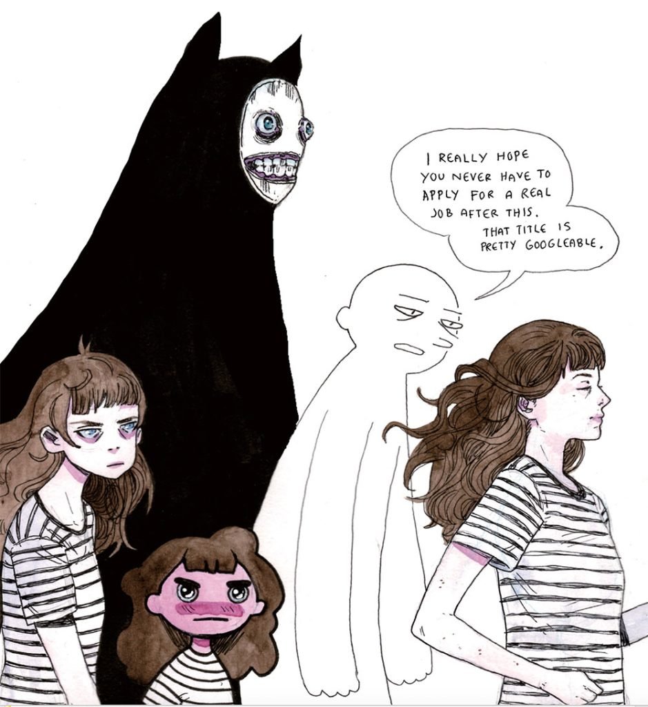 Casi treinta años después, una chica británica de 23 años publica su segunda historieta en formato de libro. En sus páginas se dibuja a sí misma de cinco formas distintas. Cada una representa un aspecto de personalidad. Una para la artista plena y exitosa. Otra para la artista desastre, enquilombada, conflictuada. Uno para la niña que supo ser, que dibujaba todo el día y no hablaba con nadie. Una silueta con cara y cuerpo largo, cansado, que representa su lado racional, su conciencia. Y por encima, acechando a todas las demás, un espectro negro que viste una máscara terrorífica.