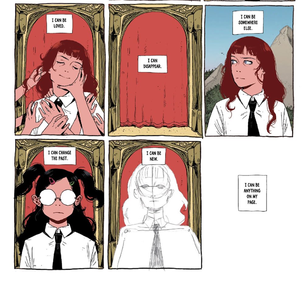 Es un viaje íntimo, oscuro y totalmente metanarrativo: una historia que se narra a sí misma, se arma y se desarma con cada página, combinando un montón de recursos expresivos completamente novedosos. De una página a otra, un personaje puede hacerse cargo de la narración, o la historia se puede transformar en un mensaje de texto, un borrador, o hasta una página en blanco.
